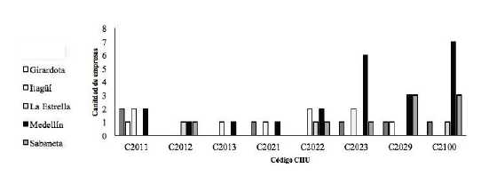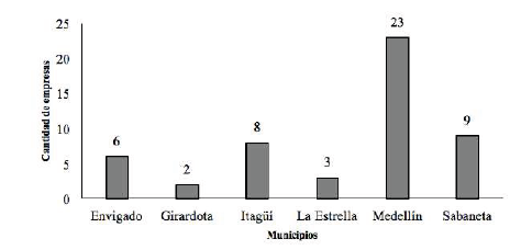 No todas estas empresas están ubicadas en el mismo municipio de la región del Área Metropolitana del Valle de Aburrá. La Figura 3 muestra que la mayoria de estas (23) se encuentra ubicada en la ciudad de Medelliín; seguido por los municipios de Sabaneta, Itagùi. (Zonas Industriales) y Envigado; Lo cuales cuentas con 9, 8 y 7 respectivamente.