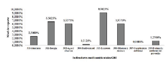 Elaboración propia con base en GRI Database.Por otra parte, las empresas mexicanas analizadas arrojan un resultado un poco similar, debido que los indicadores con mayor reporte son: 302-Energía, 305-Emisiones, 306-Efluentes y residuos con un porcentaje similar y, en tercer lugar, 303-Agua y efluentes. Finalmente, se muestran los indicadores con menor incidencia: 308-Evaluación ambiental del proveedor, 307- Cumplimiento ambiental, 301-Materiales y 304-Biodiversidad.