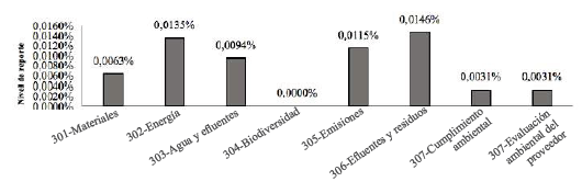 Elaboración propia con base al GRI Database.En primer lugar, respecto a las empresas del gigante suramericano, se presentan resultados analizados de mayor a menor, respecto al nivel de reporte. De acuerdo con esto, la situación más favorable se da para los intereses de los indicadores 305-Emisiones y 302-Energía, continuando con los estándares 303-Agua y efluentes y 306-Efluentes y residuos, y mostrando los números más bajos ante los similares 301-Materiales, 308-Evaluación ambiental del proveedor, 304-Biodiversidad y 307-Cumplimiento ambiental.