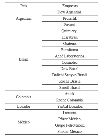 Elaboración propia con base en GRI Database.Con los países seleccionados, se procedió a escoger las empresas del sector químico, las cuales habían reportado por lo menos un informe de sostenibilidad desarrollado bajo los estándares del Global Reporting Initiative, en GRI Database, en un intervalo de tiempo comprendido entre los años 2013 y 2018. La Tabla 1 muestra las empresas químicas latinoamericanas que cumplieron los dos requisitos anteriores, las cuales fueron diez brasileñas, cuatro mexicanas, tres argentinas, dos colombianas y una ecuatoriana.