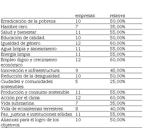 Elaboración propia con base al GRI Database.De las 20 empresas analizadas, el índice de reporte es positivo, porque la inclusión de los ODS bajo la óptica empresarial es algo reciente, como se había mencionado anteriormente, viene desarrollándose desde el año 2016; además, muchas de las empresas carecen de conocimientos y recursos para poder adaptarlos e incluirlos en el informe de sostenibilidad (Naciones Unidas, 2018). Sin embargo, se espera que, con el tiempo, más organizaciones puedan incorporar lo planteado por los ODS de manera oportuna y precisa.