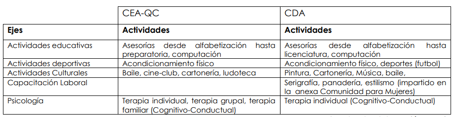 Aunado a ello, existían actividades que no eran permanentes y que eran impartidas por instituciones externas u organizaciones de la sociedad civil que se enfocaban básicamente en actividades culturales o de desarrollo de habilidades motrices o de autoestima.