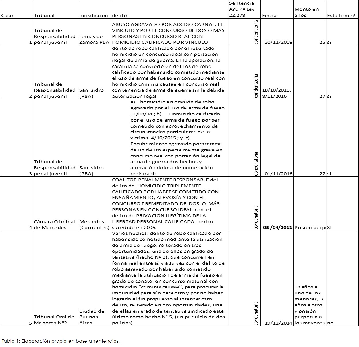 Se trata de cinco casos en que los jóvenes que cometieron sus delitos siendo menores de edad, cometieron delitos graves, que en todos los casos supusieron la supresión de la vida de otro u otros. Tal como se verá, son casos que desde lo estrictamente jurídico no arrojan mayor margen de duda acerca del reproche que merecen una vez acreditada la participación de los jóvenes en los mismos. Los casos corresponden a distintas jurisdicciones del país, es decir que han intervenido diferentes tribunales que se han regido por distintos códigos de procedimientos, pero una misma ley de fondo, la ley 22.278. Otra particularidad de los casos es que todos han tenido ruteros judiciales interesantes a ser reconstruidos desde los incidentes y recursos que generaron.