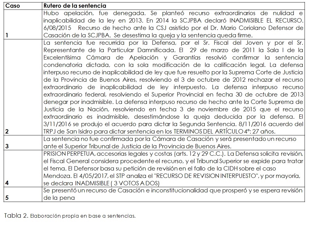 Realizada la descripción precedente, en este apartado y a través del análisis de cinco casos de jóvenes que recibieron sentencias condenatorias con fecha posterior al año 2008, es decir, post fallo Maldonado, y en algunos casos, post fallo de la CIDH en 2013, mostraré como la cuestión del fin de la pena en su carácter socioeducativo, la minoría de edad como atenuante, y el carácter o no vinculante de los tratados, ordenamientos o recomendaciones internacionales, aún son materia de interpretación y la disputa por el sentido se dirime a través de procesos de judicialización en que son los tribunales de alzada los que tienen la última palabra. No es el objetivo de este articulo deternerse en al análisis de los argumentos jurídicos, cuestión que bien saben hacer los juristas, sino, poner de manifiesto que la disputa jurídica en torno a los límites y topes de pena, es posible a partir de la vigencia de una legislación que habilita –por omisión- esa discrecionalidad.