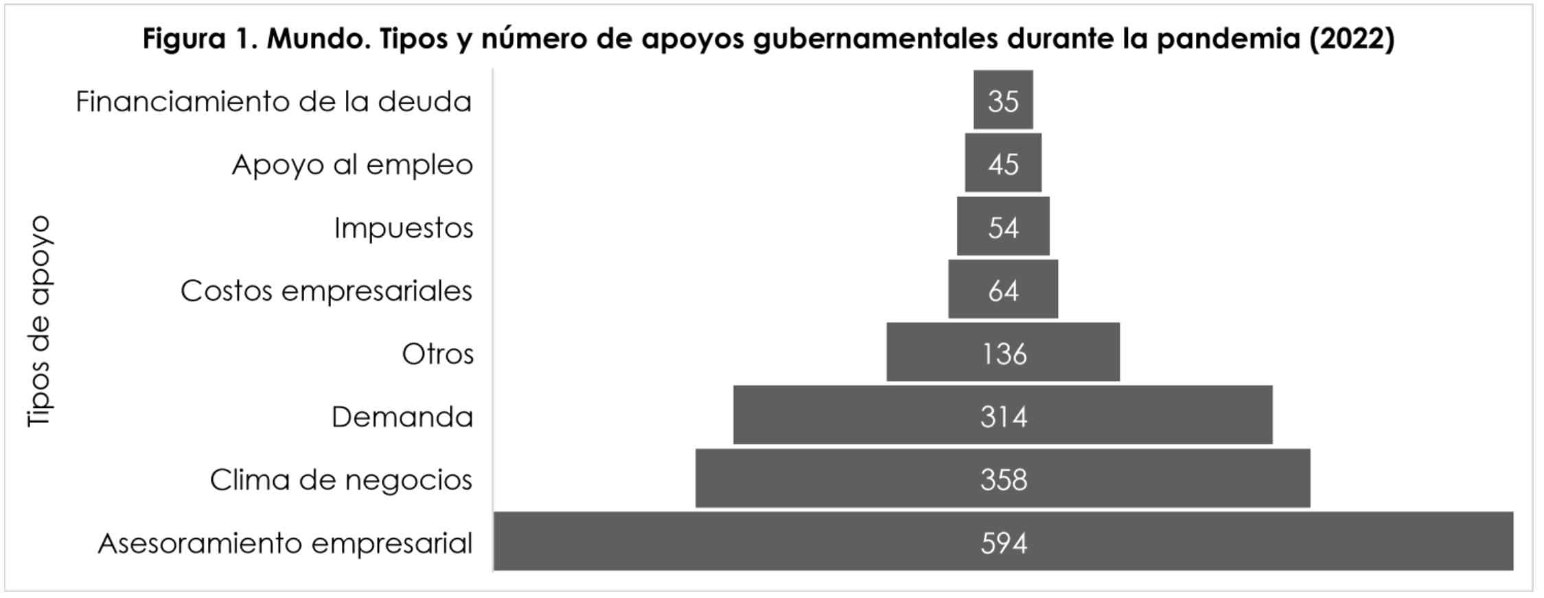 Al respecto, la información del Map of SME-Support Measures in Response to COVID-19, espacio de monitoreo creado por el Banco Mundial (BM) sobre las medidas implementadas por los gobiernos durante la emergencia, es reveladora. En todo el mundo se tienen registrados 8 tipos de apoyos que en conjunto concentran 1600 acciones concretas. La figura 1 muestra su distribución.
