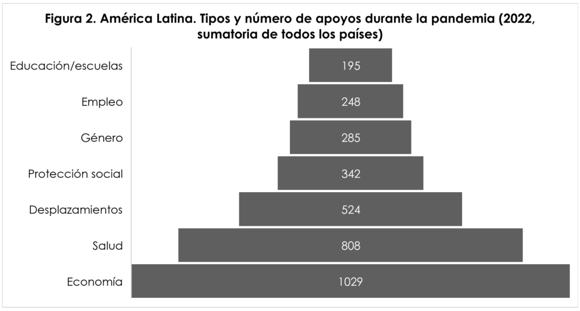 En el caso de la región latinoamericana, la CEPAL dispone de datos acerca de las medidas implementadas por los gobiernos. Esta información se resume en la figura 2. Realizando la suma de los planes ejecutados por cada país, el total de instrumentos fue de 3431, siendo el sector de la economía el más beneficiado representando cerca del 30% del total de medidas por los países en su conjunto mientras el menor campo de apoyo fue la educación.