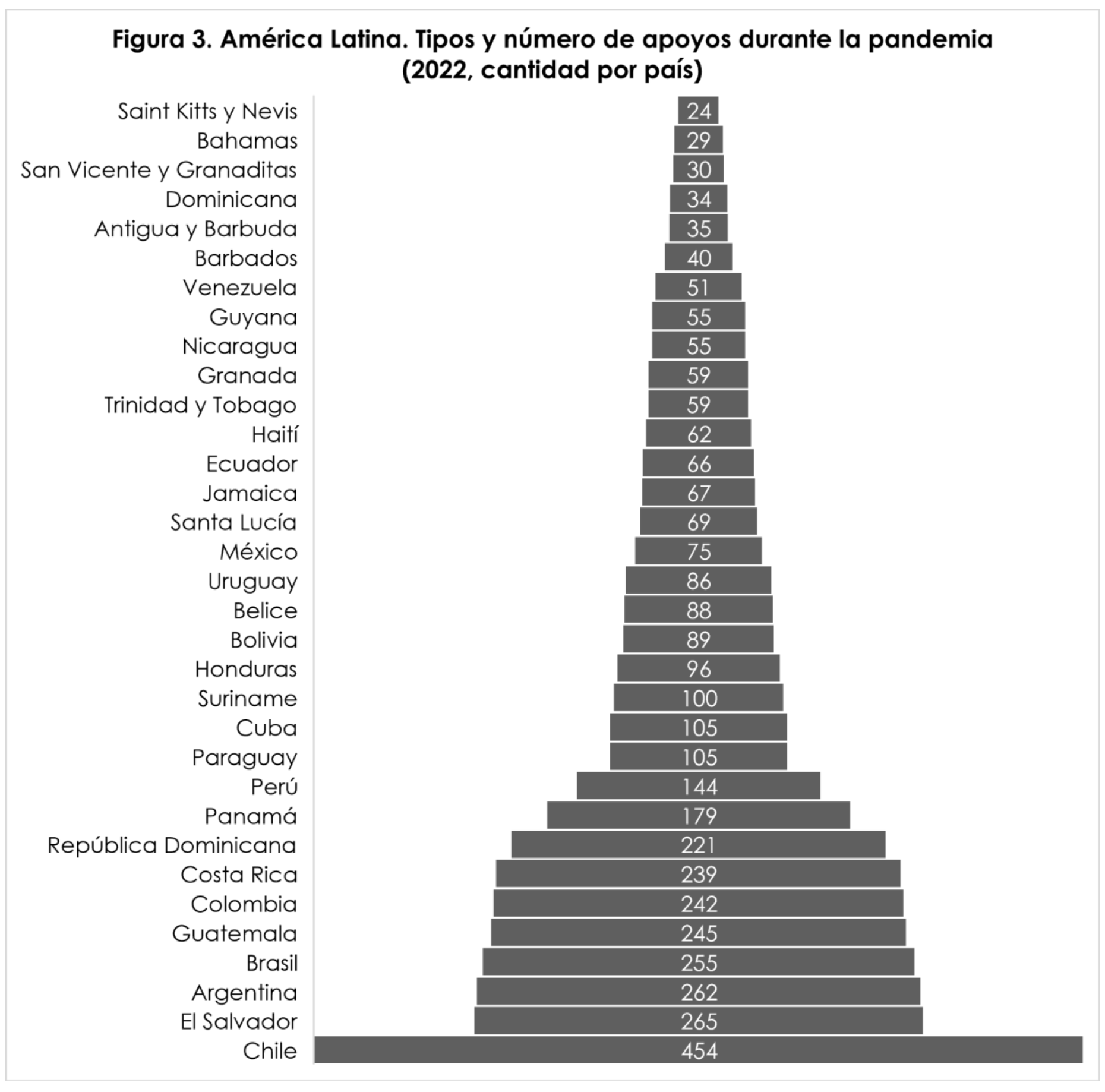 La figura 3 es posible visualizar por país el número de apoyos implementados durante la emergencia sanitaria considerando los 7 tópicos en su conjunto. Destaca el caso de Chile quien domina claramente con 454 apoyos desde el año 2019 a la fecha. Es interesante el caso de países como México, con su actual gobierno autodenominado de izquierda, está a la mitad de la distribución con apenas 75 medidas implementadas y superado por países como Belice, Honduras o Suriname. En caso sorprendente, Brasil que se encuentra dirigido por un líder derechista se sitúa en los primeros 5 países de la región con mayor impulso frente a la COVID-19.