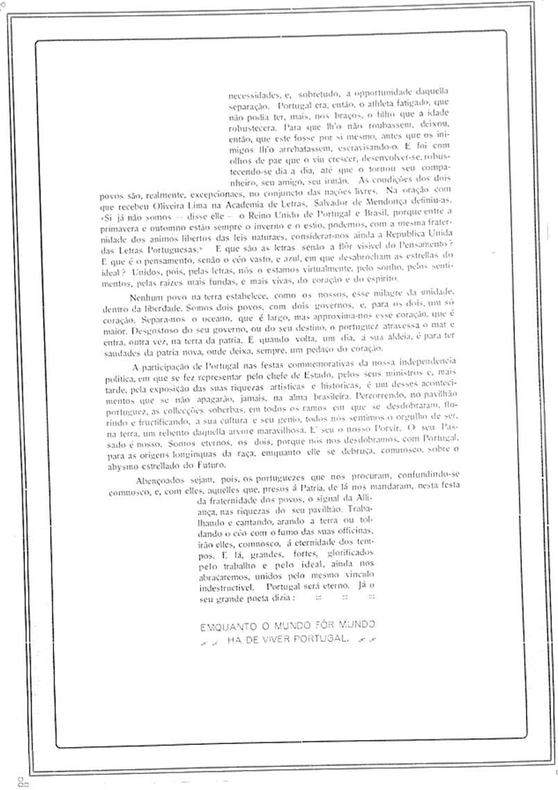 Collaboradores da mesma obra de civilização, tão juntos temos trabalhado, brasileiros e portugueses, que para sempre ficamos irmãos; irmãos, mas nos approximamos ainda, no momento do centenário da vossa independência, em que as duas pátrias como que suspendem o véo na sequencia de um destino eterno, para se unirem sobre a asa da sua tradição ancestral, como duas águias oriundas dos cerros da Lusitania que quisessem sentir, por um instante, o calor do agasalho commum. Homem simples e modesto, figura transitoria da vida pública do meu paiz, por mim, brasileiros, nada vos posso fazer que tenha valor. Mas no meu coração conduzo até vos um sentimento imorredouro, que é o amor dos portugueses a vossa patria, acolhedora e resplandecente, patria fecunda e generosa, onde, como se fôra a sua, devotados á terra e respeitando as leis, trabalham honradamente tantos filhos queridos de Portugal.