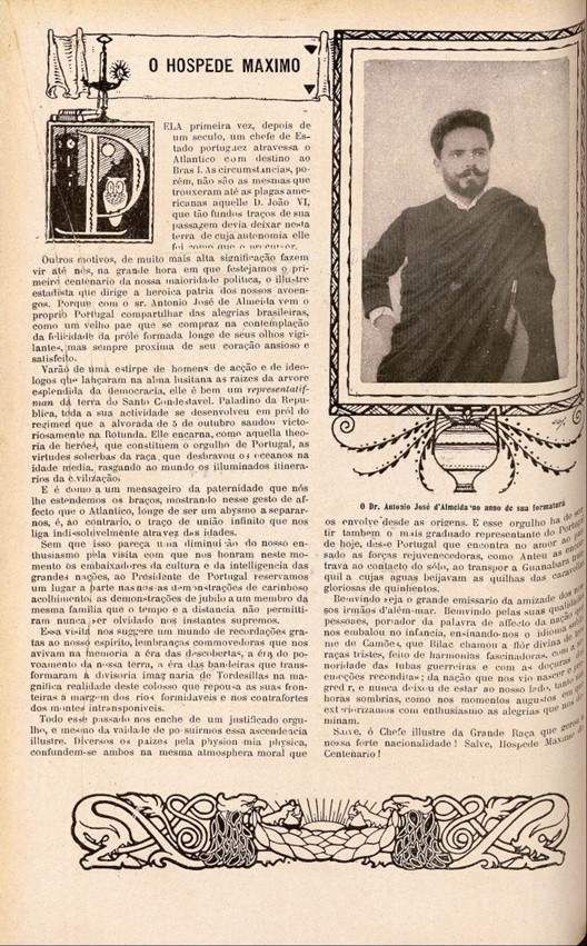 Nesta capa, observamos que aparece no topo do texto, em letras maiúsculas, o breve título: “Um hospede illustre”. Advertimos que, apesar de que se focalize o presidente, o fato de estar apresentado como “hóspede” termina focalizando pela tangente o hospedeiro, portanto, o Brasil. O país ganha assim protagonismo na cena, já que para hospedar alguém, deve-se preparar a casa e abrir as portas. Em outras palavras, semanticamente, “hospedar” implica uma ação deliberada e não uma presença passiva e desinteressada. No subtítulo que vem logo abaixo, este lugar ativo dado ao país se fortalece quando se coloca o presidente em lugar de passividade, já que se utiliza o verbo “receber” para referir-se às “ações” do presidente ao chegar. Vejamos: “O dr. Antonio Jose de Almeida, presidente de Portugal, receberá hoje as primeiras homenagens dos brasileiros e dos seus compatriotas” (grifo nosso).