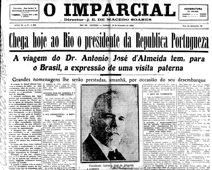 A Figura 1 representa a primeira página do jornal “O Imparcial” publicado no dia 16 de setembro de 1922, que anuncia a eminente chegada do Presidente Dr. Antonio José d’Almeida ao porto do Rio de Janeiro.