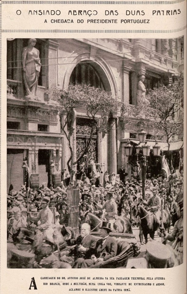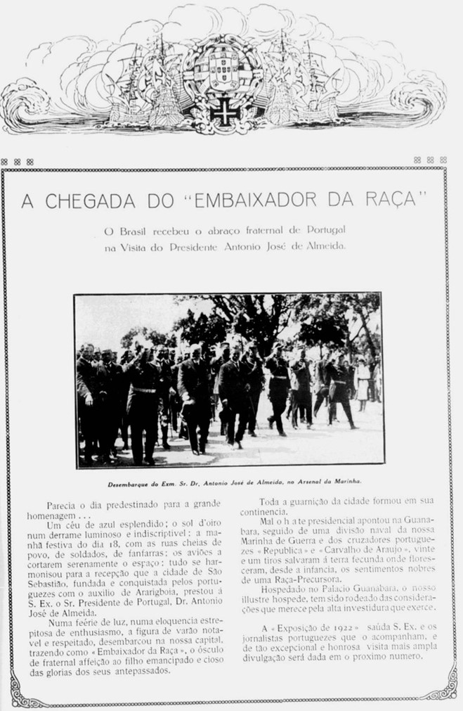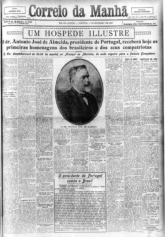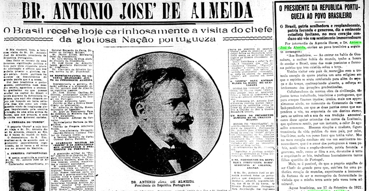 Interessa-nos observar a manchete e o subtítulo da capa do jornal, respectivamente: “Chega hoje ao Rio o presidente da Republica Portugueza” e “A viagem do Dr. Antonio José d’Almeida tem, para o Brasil, a expressão de uma visita paterna”. Destaca-se o fato de anunciar-se a chegada do presidente “da Republica Portugueza” (grifo nosso) e não “de Portugal”. Esta decisão linguística plasmada na capa do jornal põe em relevo o fato de que o referido país havia adotado o sistema republicano há pouco mais de uma década, o que justifica a necessidade de revigorar a nomenclatura.