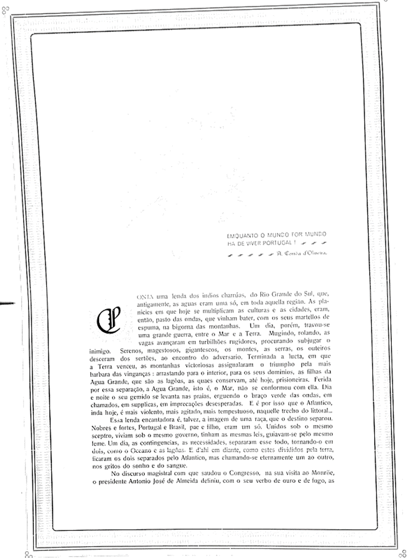 O documento da Figura 6 é um texto literário selecionado de uma revista cultural, que como o próprio nome diz, remetia à organização de uma exposição sobre o Centenário da Independência. Neste texto, observa-se a existência de um mesmo enunciado exclamativo que opera de título e de encerramento do texto: “Emquanto o mundo for mundo ha de viver Portugal!”, atribuído ao poeta António Correia de Oliveira. Portanto, em uma primeira inspeção, já podemos advertir a presença de um conteúdo pró português. Interessa-nos, particularmente, as imagens evocadas nos dois primeiros parágrafos. O autor do texto resume com precisão uma lenda de um grupo de indígenas do Rio Grande do Sul que explica porque a região tem tantas lagoas e um mar mais turbulento que o restante da costa. Como síntese do princípio do texto, conta a lenda que, antigamente, a região era formada por apenas um conjunto muito grande de águas. Logo depois de uma feroz guerra entre Mar e Terra, ficaram porções de água presas na terra e, por isso, a água do oceano bate mais forte aí, clamando por suas filhas presas no continente. Após apresentar este mito criacionista, o escritor tece um paralelo com a história do Brasil com Portugal: ambos eram, em determinado momento, uma só “raça”, uma só água, regida por um só rei; depois, por obra do destino, pai e filho se separaram, como o oceano e as lagoas. A comparação culmina com o Oceano Atlântico que separa os dois países “chamando-se eternamente um ao outro, nos gritos do sonho e do sangue.” (Figura 6, p. 6). É curioso o fato de que, nessa releitura da lenda, não há uma “grande guerra”, senão umas certas “contingências e necessidades” que separam o antigo “todo”. Trata-se de uma comparação aparentemente forçada porque, além disso, na lenda, é só o oceano-pai que clama por suas filhas-lagoa. Ou seja, estritamente falando, seria apenas o Portugal-pai quem estaria clamando por seu Brasil-filho. Em outras palavras, na construção parafrástica a via de duplo sentido é obra da recriação interpretativa do escritor que faz a língua falhar na comparação.