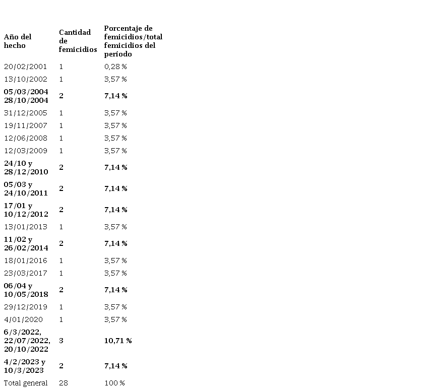 Además, se indica que, durante los años 2004, 2010, 2011, 2012, 2014, 2018 y parcialmente 2023; hubo dos femicidios por año y el periodo con más hechos fue 2022 con tres. Al mismo tiempo, se advierte que durante 2014 y 2018 los femicidios ocurrieron con menos de un mes de diferencia en 2014 y en 2018 apenas un mes, de manera similar en lo que va de 2023 se produjeron dos femicidios con una diferencia de treinta y cinco días.