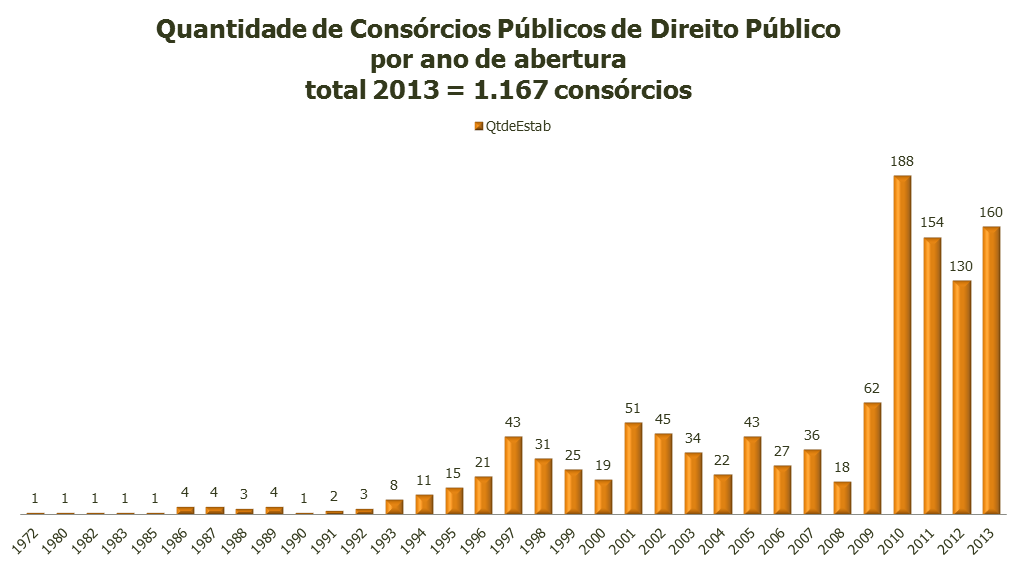 O número de consórcios públicos vem crescendo anualmente, tendo sido observada sua ocorrência em todas as regiões do País. A região na qual predomina esse tipo de associação, de acordo com Losada (2013), é a Sudeste, com um número expressivo de 407 consórcios público ativos, seguida pela região Nordeste, com 316, região Sul com 254, região Centro-oeste com 125 e a região Norte, com 65 consórcios públicos ativos até 2013.