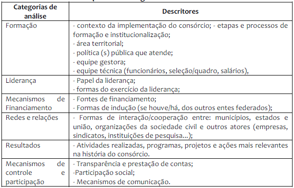 Todos os dados coletados foram analisados em relação à revisão bibliográfica e comparados entre si. A análise se deu de forma descritiva e interpretativa, a partir de categorias de análise sintetizados no Quadro 2. Essas categorias foram elaboradas a partir da observação de outros estudos realizados sobre consórcios públicos e da revisão de literatura.