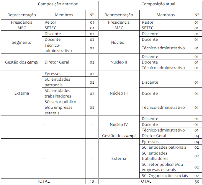 De forma geral, guardadas algumas particularidades, nos IFs a constituição de seus colegiados tem como referência predominante os segmentos da comunidade acadêmica (estudantes, professores, técnico-administrativos e egressos), do corpo gestor, dos representantes externos; neste último, específico para o Consup e o Conselho de campus. Há, ainda, no Consup, uma representação do Ministério da Educação.