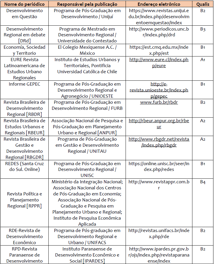 A lista acima traz apenas 12 periódicos, dois deles que publicam em espanhol (um do México, outro do Chile), os restantes 10, brasileiros, que publicam em português. Por que, por exemplo, a estadunidense Antipode ou a francesa Confins ou a espanhola Scripta Nova, reconhecidamente, importantes revistas deste (e para este) campo, não estão inclusas? A hipótese é de que investigadores brasileiros, vinculados ou não a grupos de pesquisa, ligados ou não a PPG, tendem a publicar, sobretudo, em periódicos brasileiros, talvez, em periódicos de outros países da América Latina. Voltando à lista: o ponto de partida é que o periódico seja destinatário da produção intelectual sobre desenvolvimento regional de pesquisadores brasileiros. Outro ponto importante é que todos os periódicos que integram a lista têm, pelo menos, cinco anos de existência – ou: cinco volumes publicados. Por fim, outro ponto é que todos devem ter passado pela avaliação do chamado “Qualis Periódicos” da CAPES. Já a razão para elaborar uma lista que contenha apenas 12 periódicos é arbitrária (poder-se-ia fazer uma lista menor ou maior). E a razão para que fossem incluídos exatamente estes 12 periódicos decorre de consulta um pouco mais cuidadosa ao “Qualis Periódicos” da área “Planejamento Urbano e Regional/Demografia”. Cumpre registrar que se consideraram os 18 PPG e os três Mestrados Profissionais em Desenvolvimento Regional, tanto para se aferir o destino da produção intelectual de seus docentes quanto para se verificar se algum dos PPG edita alguma revista.