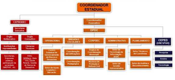 No estado do Paraná, a Defesa Civil foi criada em 1972, pelo Decreto Estadual n° 3.002, passando a Coordenadoria Estadual de Defesa Civil para o âmbito da Casa Militar em 1992, conforme Lei nº 9.943. No ano após a instituição da Lei Nacional nº 12.608 de 2012, foi regulamentado o Sistema Estadual de Proteção e Defesa Civil (SEPDEC) através Decreto Estadual nº 9.557 de 2013. Por fim, em 2014 foi instituído o Sistema Paranaense de Informações para a Gestão dos Riscos a Desastres Naturais (SIGRisco), e em 2015, a Lei nº 18.519, Política Estadual de Proteção e Defesa Civil. A estruturação atual do Sistema Estadual de Proteção e Defesa Civil pode ser observada na Figura 1.