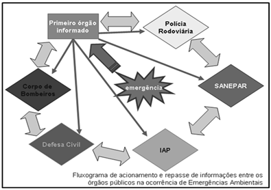 Os acidentes que desencadeiam as emergências ambientais são fatos cujas consequências abrangem diversas áreas, em caráter simultâneo ou com lapso sequencial de tempo. O hodierno sistema de atendimento se apresenta como um conjunto de órgãos que são acionados a partir do primeiro que chega ao local do acidente, como medida proveniente de um acordo previsto no Plano Estadual de Produtos Perigosos, conforme segue: