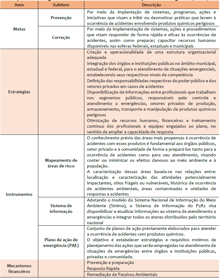 Não obstante, a falta de preparação dos agentes, assim como dos gestores locais quanto a fiscalização e medidas emergenciais no caso de acidentes, potencializa os impactos negativos provenientes destes produtos. É por isto que o Sistema Nacional do Meio Ambiente (SISNAMA) juntamente ao Ministério do Meio Ambiente (MMA), desenvolveram o Plano Nacional de Prevenção, Preparação e Resposta Rápida a Acidentes Ambientais com Produtos Perigosos (P2R2), instituído pelo Decreto n° 5.098 de 2004, com o objetivo de não apenas aprimorar o sistema de preparação e resposta a emergências químicas existentes no País, mas principalmente de buscar mecanismos que previnam a ocorrência de acidentes com produtos perigosos (MMA, 2004).