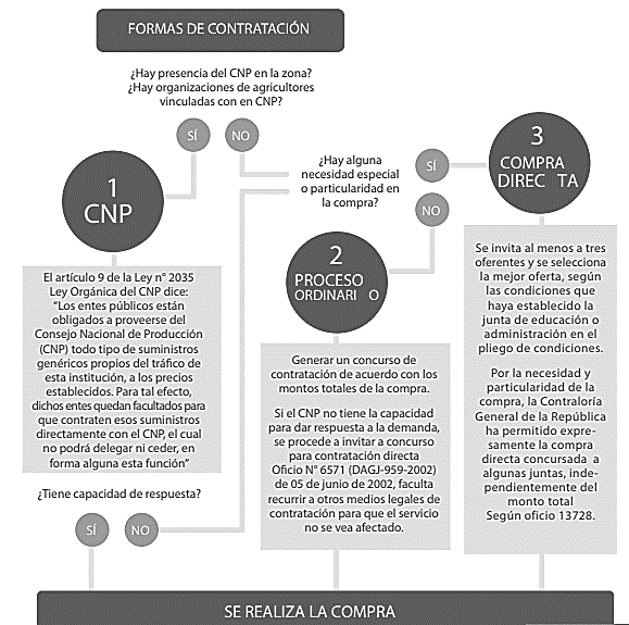 La compra de alimentos es descentralizada, y según las disposiciones del PANEA, la Junta debe realizar el proceso de Contratación del proveedor de alimentos de conformidad con el proceso de licitación pública de la Ley de Contratación Administrativa Nº 7494 y sus reformas y, el Reglamento General de Juntas de Educación y Administrativas (MEP, 2012). Sin embargo, debido a las exigencias fiscales para justificar las compras, algunas Juntas en el país están autorizadas por la Contraloría General de la República, para hacer las compras mediante la contratación directa. Para eso, las Juntas deben solicitar la autorización a la Contraloría.