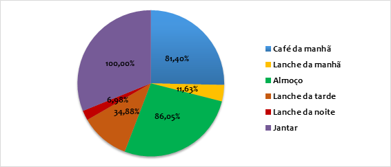 Os resultados indicam que regularmente o número total de refeições realizadas no domicílio das interlocutoras é principalmente de três e no máximo quatro ao dia. Diariamente 32,56% da amostra afirmou realizar ao menos quatro refeições, dividindo-as entre café da manhã (81,40%), almoço (86,05%), jantar (100%) e lanche da tarde (34,88%). Igualmente 32,56% realizam três refeições entre café da manhã, almoço e jantar, ficando fora o lanche da tarde. As divisões dessas ingestas são observadas no Gráfico 1, a seguir.