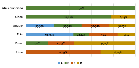 Em termos de perfil de consumo socioeconômico, esses números variam de um a outro. O Gráfico 2, a seguir, apresenta os resultados do número de refeições realizadas ao dia no domicílio, enquanto a Tabela 1 a divisão dessas refeições. As consumidoras participantes do perfil ‘A’ realizam principalmente de três (66,67%) a quatro (33,33%) refeições, sendo essas divididas entre café da manhã, almoço e jantar, todas com o mesmo percentual (100%) e, em menor grau, o lanche da tarde (33,33%). O perfil ‘B’ faz preferencialmente quatro refeições (33,34%), seguida de três e cinco (22,22%). Nesse caso, as refeições dividem-se em café da manhã (100%), almoço (88,89%) e jantar (100%). É possível que esses dois grupos de consumo possam se caracterizar a partir de práticas alimentares atreladas a questões de ordem médicas e nutricionais, por estarem preocupados com a saúde e a boa forma física, atendendo às indicações estabelecidas. Ou ainda, pelo fato de terem disponíveis uma maior quantidade e variedade de alimentos já que são as consumidoras com uma maior renda socioeconômica.