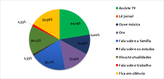 Identificou-se que a principal atividade realizada por elas é, para 44,19% da amostra, assistir televisão. Conforme Barbosa (2007), esse meio de comunicação possui relevância diante do ato de comer, pois se pode constatar que a refeição familiar é mediada por ela em 69% dos casos no Brasil. Sua presença é ainda mais consistente durante o jantar ao fornecer o pano de fundo para as conversas à mesa. Desse modo, às vezes, a televisão ganha proeminência sobre as conversas; em outras, ela desaparece e, em outras circunstâncias, os eventos que estão sendo televisionados são o motivo da conversa.