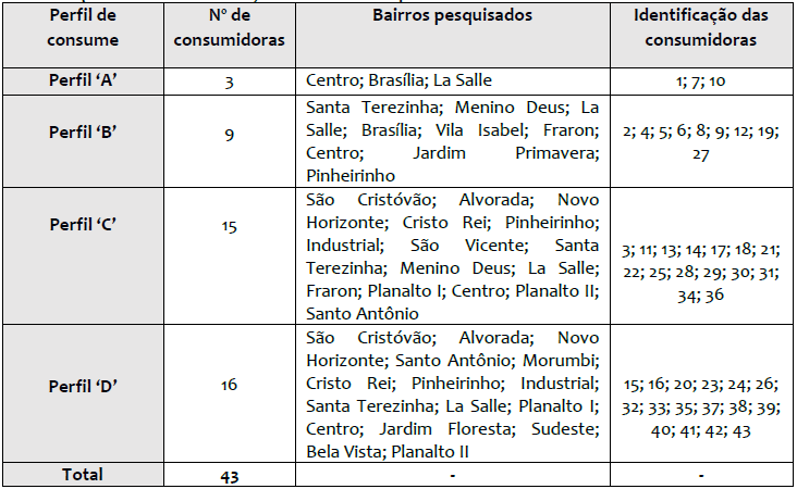Estabeleceu-se previamente quatro perfis de consumo (A, B, C e D), conforme a classificação dos bairros acima mencionadas. No Quadro 1, visualiza-se a distribuição da amostra segundo a classificação por perfil de rendimento, o número de consumidoras pesquisadas, os respectivos bairros e a identificação das consumidoras investigadas.