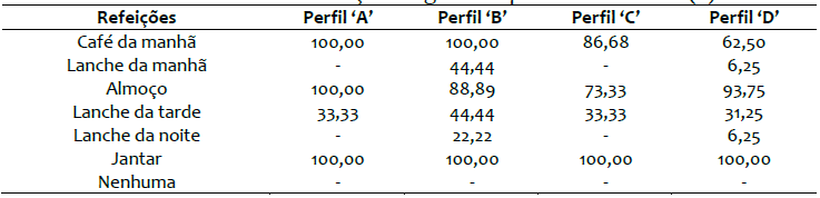 Aquelas que preferem se alimentar de lanches são principalmente os do perfil ‘C’ (66,67%), em menor proporção os do perfil ‘D’ (37,50%) e com o mesmo número os perfis ‘A’ e ‘B’ (33,33%). Não jantar não é uma possibilidade para nenhum dos perfis, revelando a importância dessa refeição em relação às demais. Além disso, verifica-se que a crença de que ‘o jantar engorda’ e pode ser retirado do sistema de refeições não se aplica nesse caso.