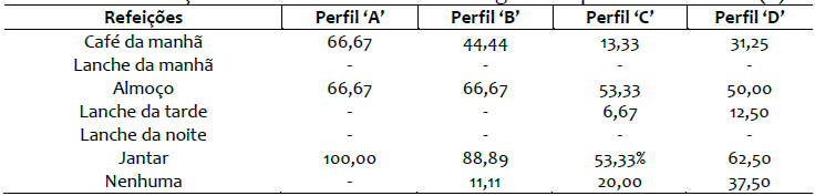 O jantar, para os quatro perfis, é a refeição mais significativa em relação à reunião familiar. O fato de nenhuma refeição acontecer de forma coletiva no domicílio ocorre para 37,50% das participantes do perfil ‘D’, 20% para as do perfil ‘C’ e 11,11% para as do perfil ‘B’. Nesse caso, as participantes afirmam morar sozinhas ou realizar parte das refeições em seus locais de trabalho, não coincidindo com os horários dos demais moradores do domicílio. Outras declaram possuir filhos matriculados em creches ou escolas em tempo integral, realizando todas as refeições nesses espaços.