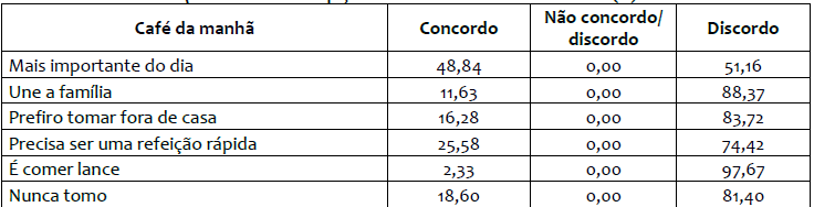 No contexto desse estudo, o café da manhã não é caracterizado como uma refeição familiar, embora seja aquela que preferencialmente se busca fazer em casa (Quadro 2). Nesse sentido, 88,37% da amostra disse discordar que essa refeição ‘une a família’, enquanto 83,72% prefere tomar café no domicílio. Essa pode ser considerada uma refeição bastante individualizada e, por vezes, desordenada devida às atividades dos membros da família ou do grupo doméstico. Habitualmente, durante sua ingestão pouco se fala e quando isso acontece os assuntos giram em torno das obrigações e das tarefas do dia (BARBOSA, 2009).