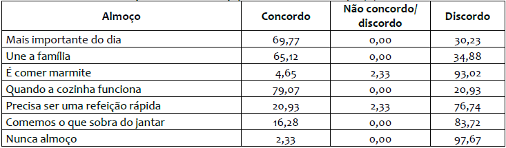 Provavelmente essas são as mesmas consumidoras que concordam que por falta de tempo o almoço precisa ser uma refeição rápida (20,93%), todavia, a maioria das participantes (76,74%) discordam dessa situação, podendo realizá-la de forma tranquila. Essa não é a realidade dos grandes centros urbanos, como foi constatado por Barbosa (2009), pois o almoço é tido como uma refeição tumultuada e quase nunca visto como momento de lazer e relaxamento. Explica a autora que a interação social se centra naquilo que é preciso fazer de imediato, de modo que as atividades da rua invadem a casa de forma impessoal, orientando o ritmo das ações internas. Contudo, à medida que a semana avança, a sociabilidade tende a aumentar e até mesmo a qualidade da comida. O almoço de final de semana e especialmente o de domingo é aquele para o qual se dedica o maior tempo para preparação e consumo, caracterizando-se pela reunião familiar em torno da mesa. A escolha do cardápio foge do tradicional ‘arroz com feijão’ cotidiano, variando em termos de sabor e satisfação das preferências individuais (BARBOSA, 2007).