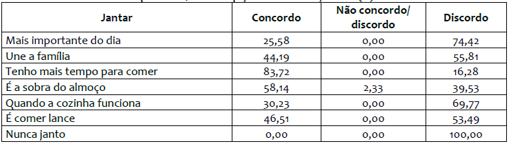 Os dados sobre o jantar não o qualificam como a refeição mais importante do dia, 74,42% das participantes discordam dessa afirmação (Quadro 4). O estudo de Castro e Abdala (2011) colabora com esse resultado ao se verificar que, apenas em 8% dos relatos, o associam à refeição principal, é entendido com certo descompromisso considerando que sua composição pode variar entre um simples lanche a uma ‘verdadeira janta’. Além disso, não se caracteriza neste estudo como a refeição que mais reúne a família (55,81%), apesar de ser apontado como aquela que habitualmente é realizada coletivamente (Gráfico 3).