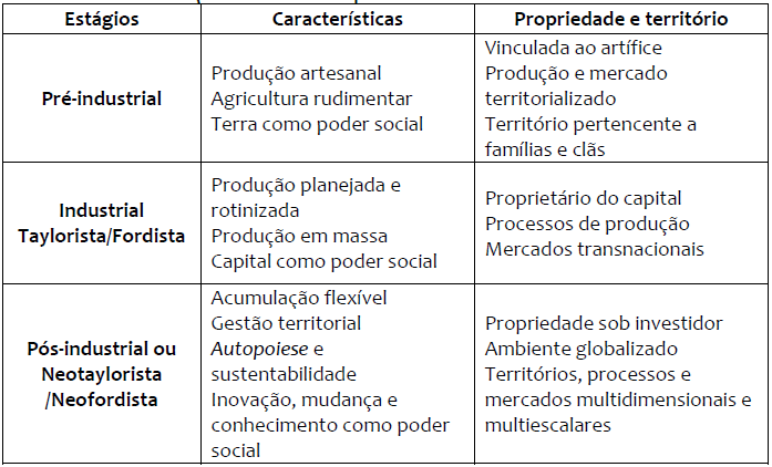 O Quadro 1 resume as características dos macroperíodos de organização da produção, partindo do modelo pré-industrial, caracterizado pelo trabalho artesanal, tendo como proprietário o artífice, com formação baseada nas demandas locais e com conhecimento restrito ao transmitido pela família, passado de geração para geração. Já a organização neotaylorista/fordista descreve as características dos regimes de acumulação com os principais focos organizacionais e territoriais, inclusive com possibilidades pós-industriais. Acredita-se que esses elementos contribuem para a análise dos regimes de acumulação, das mudanças nos ambientes organizacionais e territoriais, assim como para a realização de um contraponto à teoria organizacional, hegemonicamente positivista.