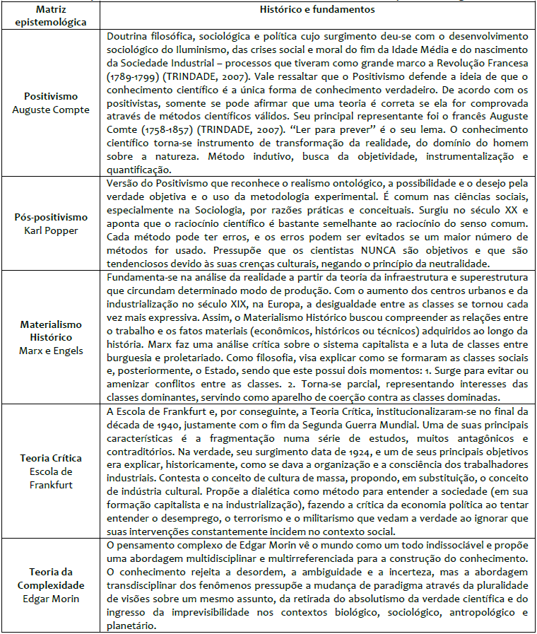 Como ponto de partida, apresentam-se as matrizes epistemológicas (Positivismo, Materialismo Histórico e Teoria da Complexidade), a partir de uma análise pautada na Teoria Crítica influenciada por Marx (1974), conhecida também como Escola de Frankfurt, com origem em Horkheimer (1974), seguida por Horkheimer e Adorno (1985), Marcuse (1973) e Habermas (2004).