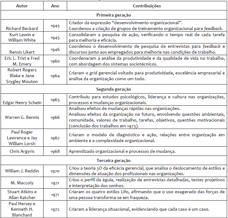O DO ainda é um tema pouco discutido nas ciências sociais aplicadas e apresenta uma genealogia mais interativa, apesar de contar com características positivistas, com influência da Teoria Comportamentalista, e da Teoria Contingencial e Sistêmica. Caravantes, Panno e Kloeckner (2005 p. 210) conceituam o DO como uma “[...] mudança planejada, articulada, pensada e não reativa ao sabor dos ventos”. A obra de Bennis (1972) representou um marco para o DO e contribuiu para a mudança organizacional, devido à necessidade de busca de alternativas diante da crise dos modelos fordistas.