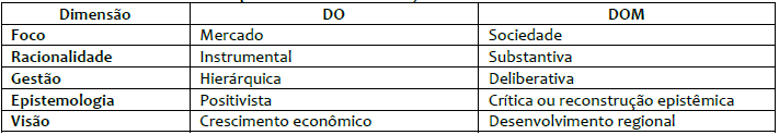 Salienta-se a importância de pensar em uma análise que ultrapasse a centralidade do mercado e a predominância dos aspectos econômicos, levando em conta outras questões relevantes para a definição de um marco teórico do DOM. Em termos epistemológicos, apresentam-se alguns elementos que se contrapõem à teoria do DO e apontam para a possibilidade de efetivação do DOM, conforme apresentado no Quadro 4.