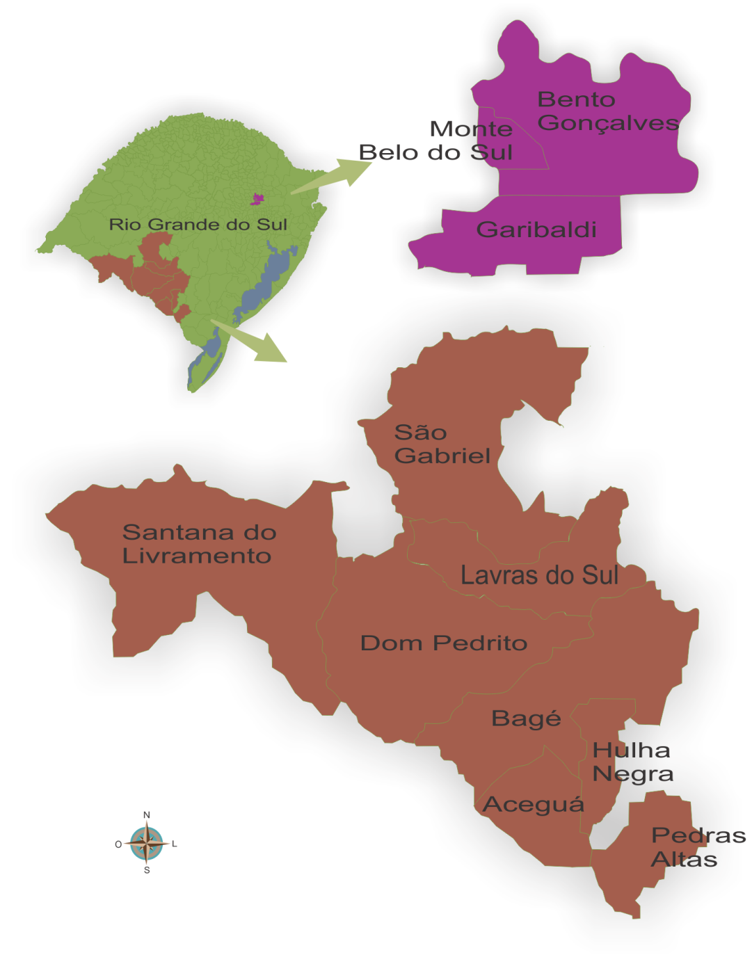 Nossa reflexão, que explora as interfaces entre indicações geográficas e desenvolvimento territorial, pauta-se na análise de duas experiências referenciais existentes no Rio Grande do Sul (ver Fig. 1). O material de análise foi colhido em 26 entrevistas realizadas, de modo intermitente, entre os anos 2008 e 2012, com diferentes atores sociais (representantes de empresas, de Conselhos Reguladores, associações de produtores, extensionistas rurais, agricultores, etc.)3.