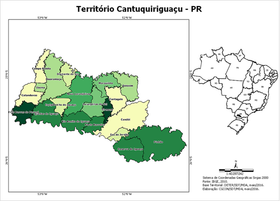 O Território da Cidadania Cantuquiriguaçu5, localizado no Estado do Paraná, foi parte integrante do Programa Territórios da Cidadania do governo federal, criado em 2008. A região é constituída por vinte municípios, sendo eles: Porto Barreiro, Campo Bonito, Candói, Cantagalo, Catanduvas, Espigão Alto do Iguaçu, Foz do Jordão, Goioxim, Guaraniaçu, Ibema, Laranjeiras do Sul, Marquinho, Nova Laranjeiras, Pinhão, Quedas do Iguaçu, Reserva do Iguaçu, Rio Bonito do Iguaçu, Três Barras do Paraná, Virmond e Diamante do Sul. Na Figura 1 é apresentada a localização da região utilizada como referência na presente pesquisa.