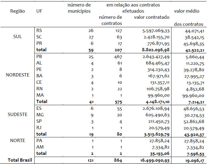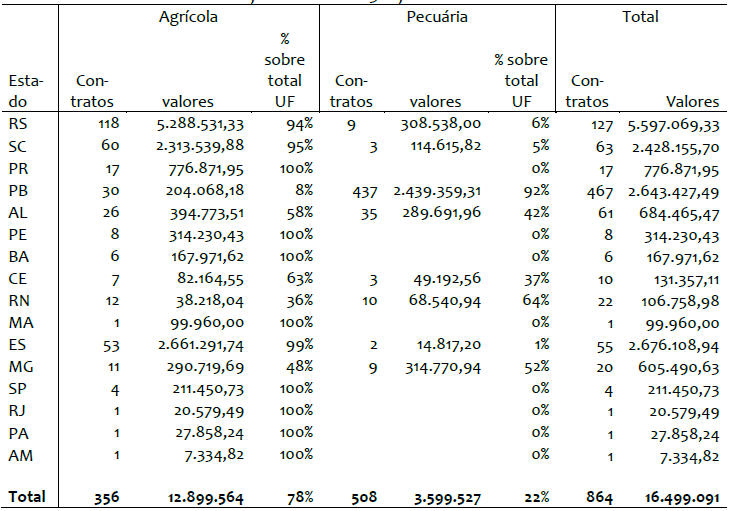 No período apresentado na Tabela 1 o subprograma em questão foi acessado em 16 (dezesseis) das Unidades da Federação (UF) do país, sendo que os três com maior número de contratos foram, respectivamente, Paraíba com 467, Rio Grande do Sul com 127 e Santa Catarina com 63 contratos. Entretanto, quando a observação recai sobre o montante acessado a ordem dos três primeiros se altera, sendo o Rio Grande do Sul aquele em que os agricultores familiares acessaram o maior volume, seguido pelo Espírito Santo e então a Paraíba. Estes resultados indicam que no caso da Paraíba as médias de volumes por contratos são menores do que as do Rio Grande do Sul, por exemplo.