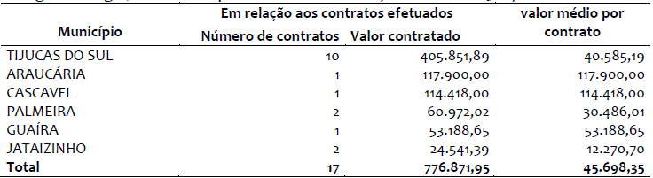Observando o Estado do Paraná, no qual está situada a região em que foi realizado este estudo, no período analisado foram efetuados 17 contratos em 6 municípios (do total de 399 municípios paranaenses), sendo eles: Tijucas do Sul, Araucária, Cascavel, Palmeira, Guaíra, Jataizinho. O valor total acessado correspondeu a R$ 776.871,95 no período.