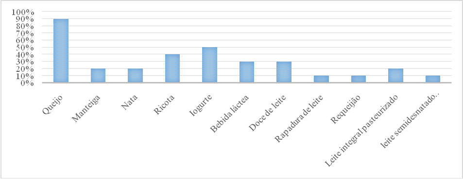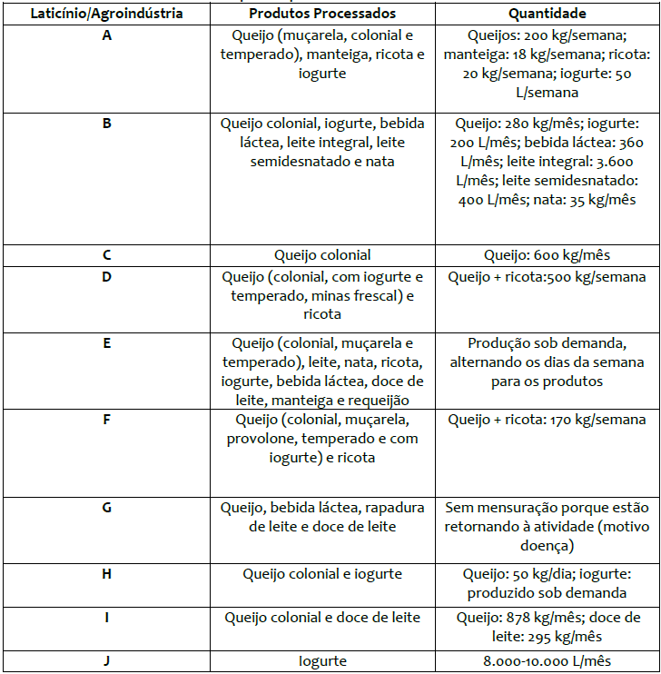 Os produtos derivados do leite que são transformados nas agroindústrias são os seguintes: queijos (muçarela, colonial, colonial temperado, com iogurte, minas frescal, provolone); manteiga; ricota; iogurte; bebida láctea; leite integral pasteurizado; leite semidesnatado pasteurizado; nata; bebida láctea; doce de leite; requeijão; rapadura de leite. Segue no Quadro 1 o resumo dos tipos e quantidade dos produtos.