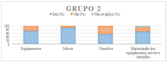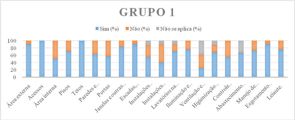 O Grupo 1 engloba as edificações e instalações das agroindústrias: área externa; acessos; área interna; pisos; tetos; paredes e divisórias; portas; janelas e outras aberturas; escadas e estruturas auxiliares; instalações sanitárias e vestiários para os manipuladores; instalações sanitárias para visitantes e outros; lavatórios na área de produção; iluminação e instalação elétrica; ventilação e climatização; higienização das instalações; controle integrado de pragas; abastecimento de água; manejo de resíduos; esgotamento sanitário; leiaute. Em alguns dos itens citados, como exemplo, em instalações sanitárias e vestiários para os manipuladores, aparecem 15 subitens de avaliações. Podemos visualizar o Grupo 1 no Gráfico 2.