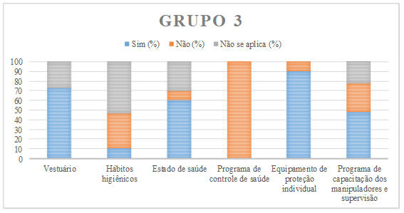 O Grupo 3 compreende manipuladores: vestuário; hábitos higiênicos; estado de saúde; programa de controle de saúde; equipamento de proteção individual; programa de capacitação dos manipuladores e supervisão. O grupo 3 é representado pelo Gráfico 4.