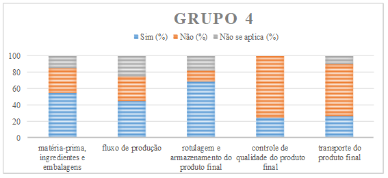O Grupo 4 é avaliado pela produção e transporte do produto final: matéria-prima, ingredientes e embalagens; fluxo de produção; rotulagem e armazenamento do produto final; controle de qualidade do produto final; transporte do produto final. Para demonstrar o Grupo 4, segue o Gráfico 5.