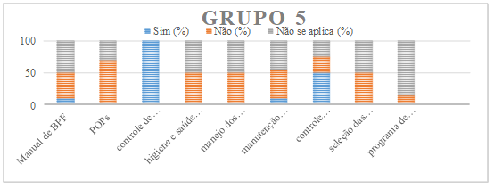 O Grupo 5 inclui a documentação: manual de boas práticas de fabricação; procedimentos operacionais padronizados; controle de potabilidade de água; higiene e saúde dos manipuladores; manejo dos resíduos; manutenção preventiva e calibração dos equipamentos; controle integrado de vetores e pragas; seleção das matérias-primas, ingredientes e embalagens; programa de recolhimento de alimentos. A seguir, o Gráfico 6 representa o Grupo 5.