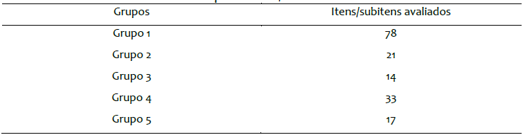 Classificaram-se os grupos de acordo com a sequência da própria ckeck list: Grupo 1 (edificação e instalações); Grupo 2 (equipamentos, móveis e utensílios); Grupo 3 (manipuladores); Grupo 4 (produção e transporte de alimento); Grupo 5 (documentação). Cada grupo contém subgrupos e estes diversos itens de avaliação e subitens, a seguir na Tabela 1.