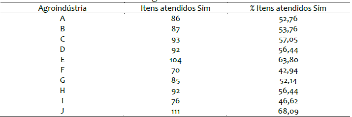 No final da Resolução nº 275/02, está presente um critério de classificação do estabelecimento, conforme seus itens atendidos, dessa maneira: Grupo 1, de 76%-100%; Grupo 2, 51-75%; Grupo 3, 0-50%. Nenhuma propriedade classificou-se no Grupo 1, 7 agroindústrias colocaram-se no Grupo 2 e três no Grupo 3. Pode-se observar na Tabela 2 a individualização dos itens atendidos.