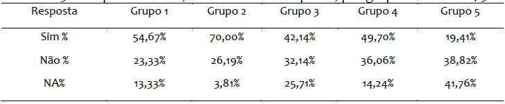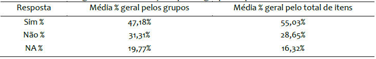 A Tabela 4 demonstra a média (%) geral por grupos, aplicando-se o mesmo valor de importância para cada grupo ao realizar a média, ou seja, 20% de importância para cada grupo, visualizando-se assim que a resposta “sim” atingiu 47,18% das respostas nos grupos. Ainda com relação à Tabela, temos a média (%) geral pelo total dos itens observados, elevando um pouco a média, já que soma todos os itens atendidos, não delimitando a importância dos grupos, pois há diferença no número de itens avaliados por grupos.